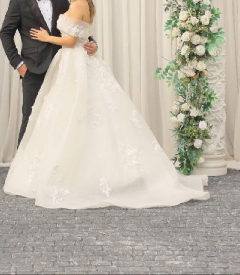 Bir kere giyildi. Vakkodan alındığı orjinal haliyle muhafaza edilmiştir herhangi bir tadilat yapışmamıştır. Bir deformasyonu yoktur. Kuru temizleme yapılmıştır. Duvak ve kese ile beraber gönderilecektir. Kırık beyaz rengindedir.2023 yılında alınmıştır.