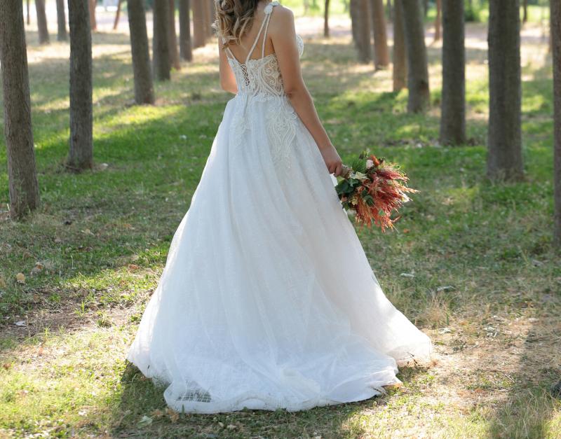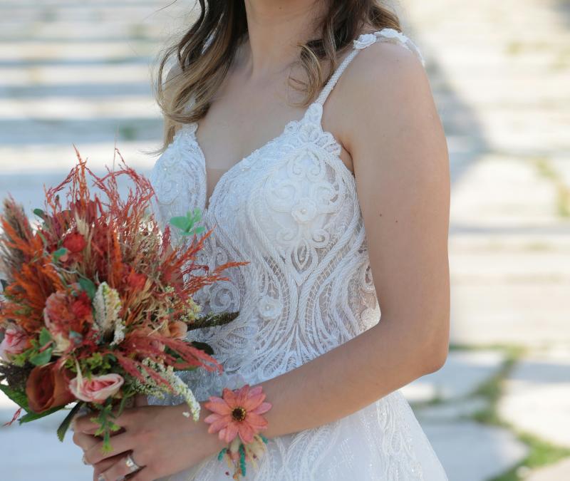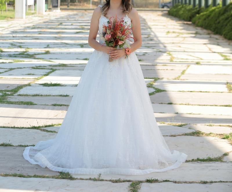 36-38 beden arasında bir gelinliktir. Izmir Alsancak'ta bir moda evi'nde dikilmiştir. Dış çekim düğün gününde olduğu için sadece bir gün gelinlik giyildi. Sahibinin Boy: 173 Kg: 59