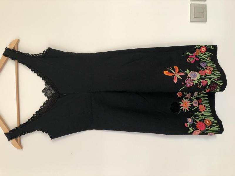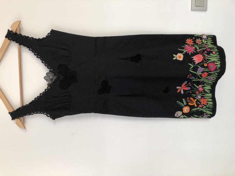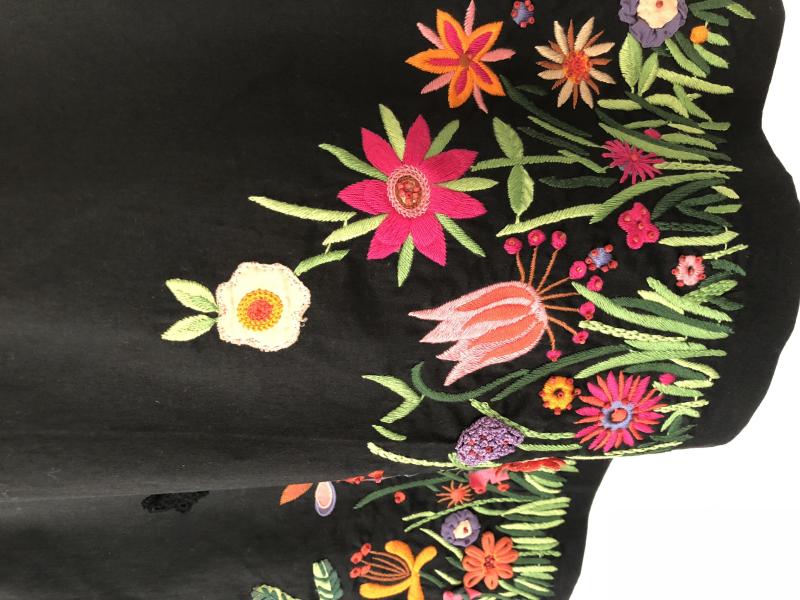 Göğüs kısmında danteller var, elbisenin alt kısmında renkli çiçek işlemeleri var.
