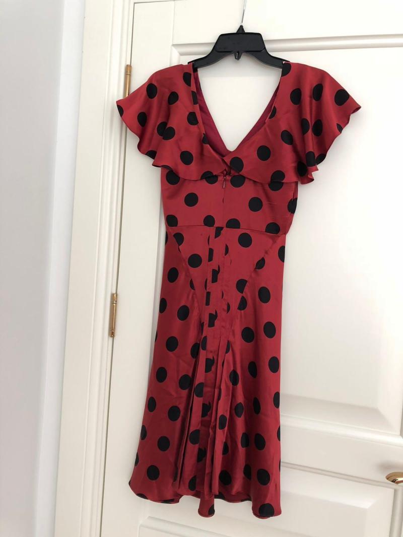 Kolları kısa ve volanlı. Önü ve sırtı V yaka. Bele oturuyor. Diz boyu. Çok şık bir davet elbisesi. Sahibinin Boy: 163 Kg: 52