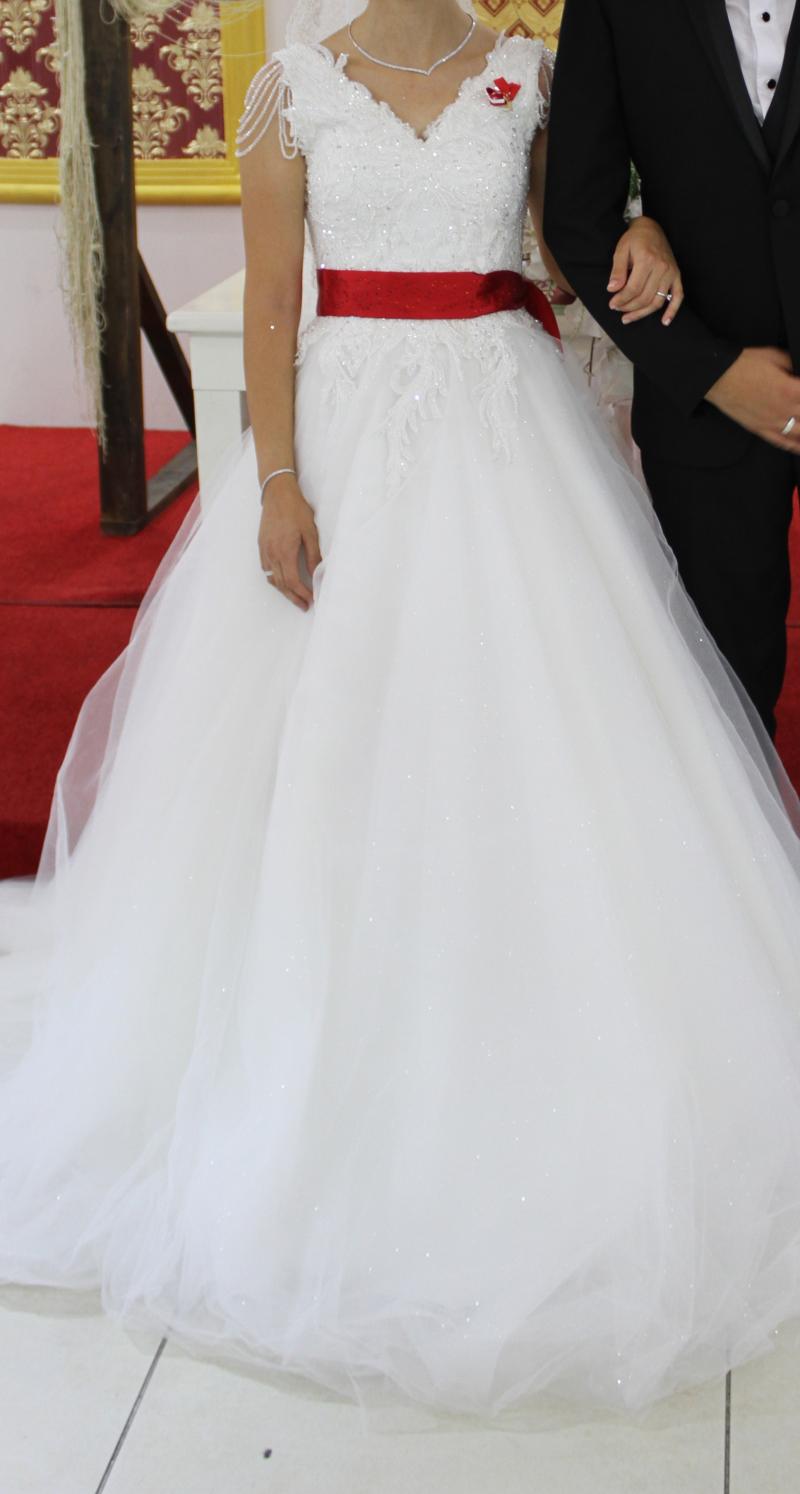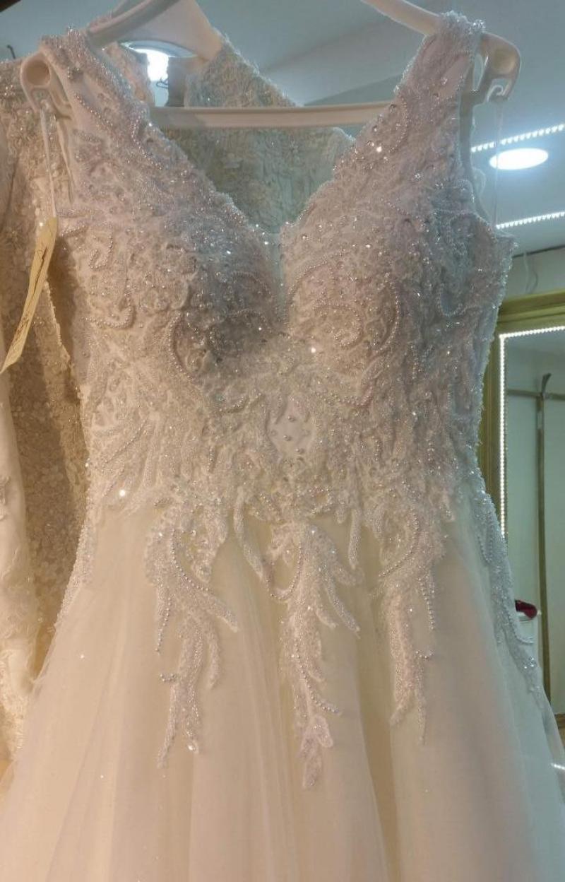 Helen model, A kesim, ince işlemeli, 36 beden, kırık beyaz gelinlik. Etek boyu kısaltılmamıştır. Fotoğraftaki duvak ve toka hediyedir. Arka kısmındaki korse iplerle genişletip-sıkılaştırılabilir. Etekte ekstra bir işleme yoktur, simlidir.