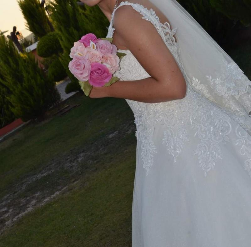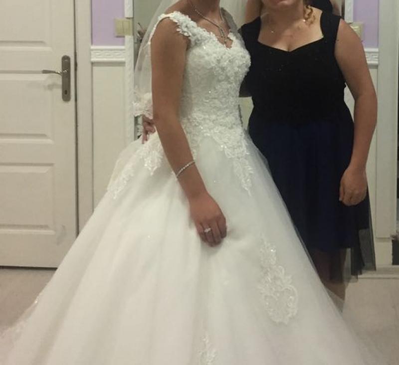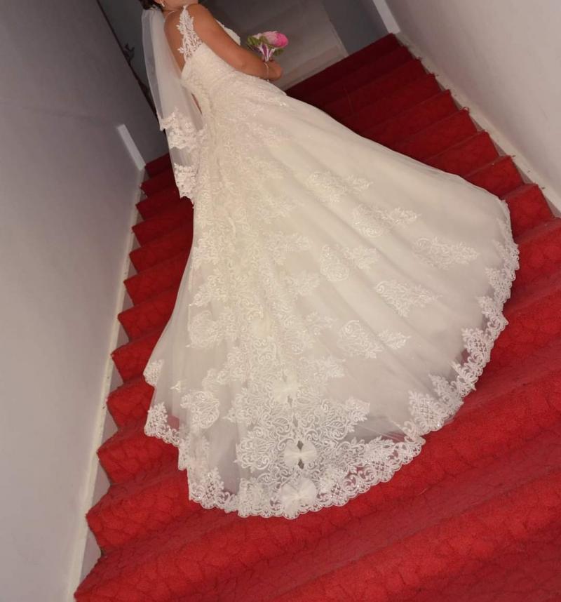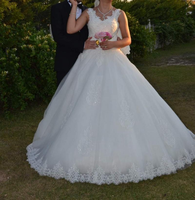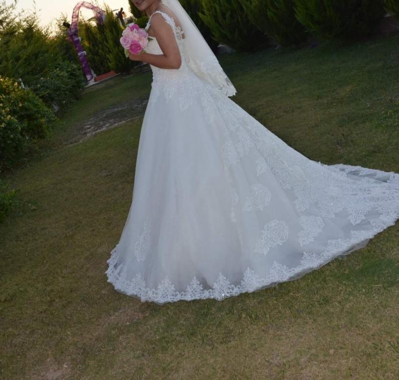 Göğüs ve omuz kısmı işlemeli, özellikle kuyruktaki dantel detayları çok hoş; rahat hareket edebileceginiz, hafif ve tertemiz bir gelinlik. 36 - 38 bedene uyar. Sırtı ipli, ayarlanabilir. Duvak, tarlatan filan herşey içinde.