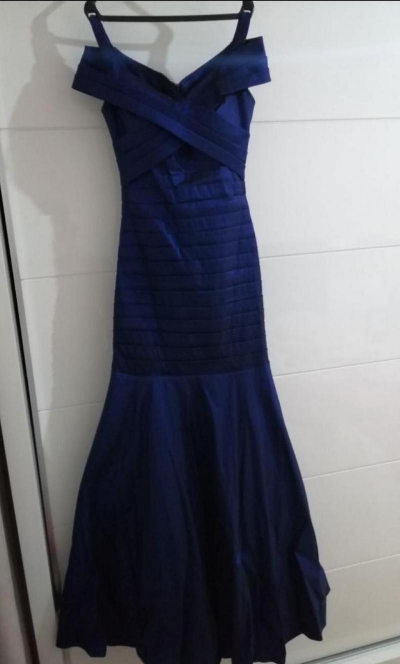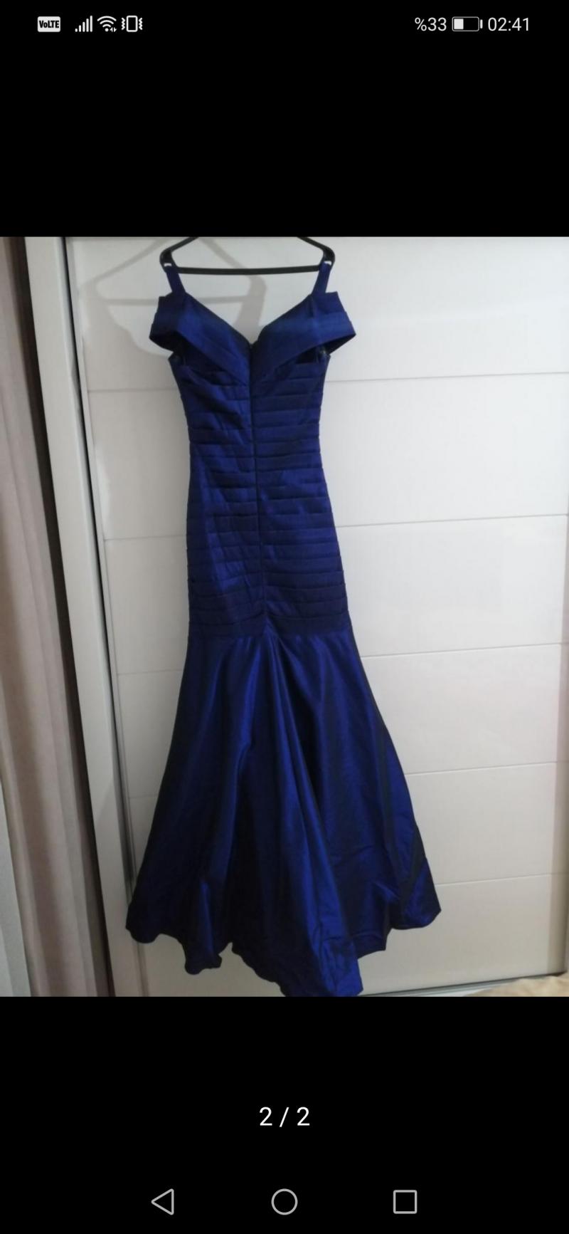 Balık model gece mavisi tafta kumaş şık gece elbisesi