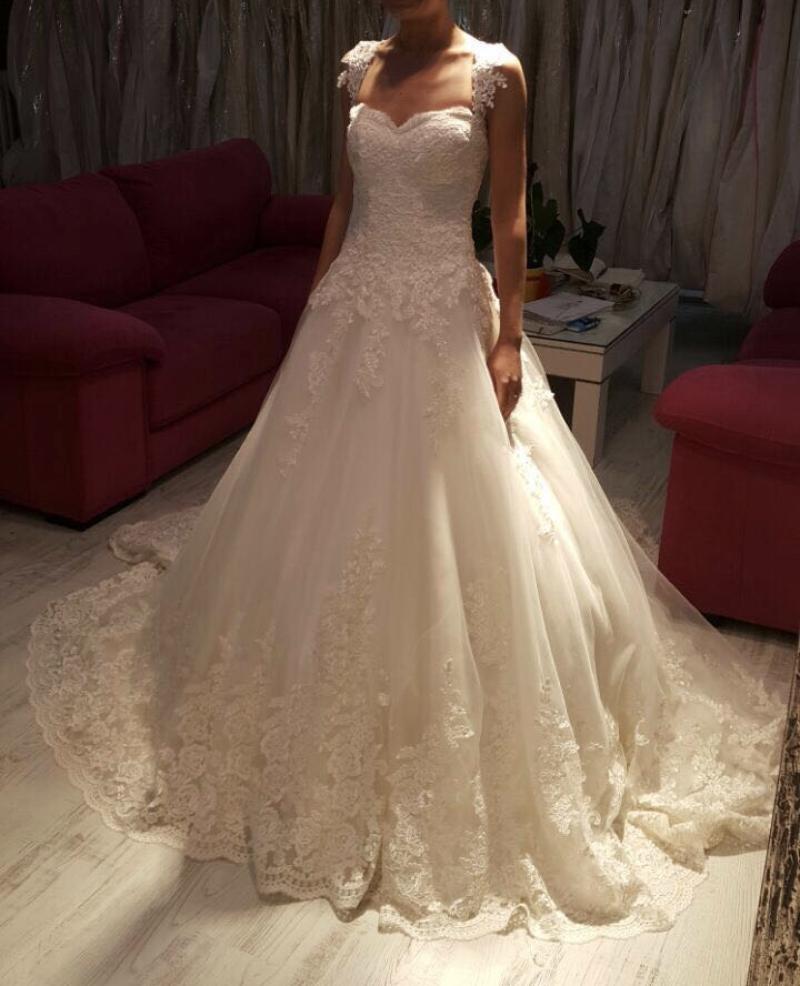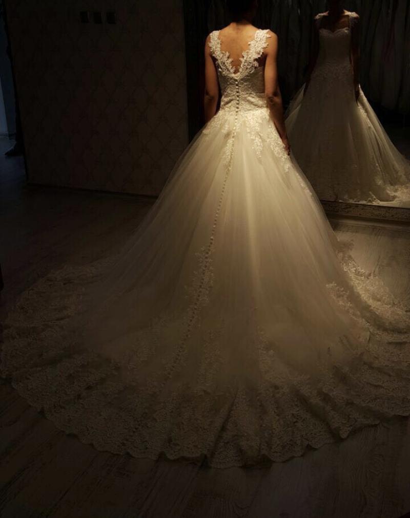 Özel dikim dantelli askılı gelinlik. 12 cm topuk ile giydim. Uçları dantelli. Askılar çıkarılıp straplez kullanılabilir. 1 kez giyildi. Sahibinin Boy: 166 Kg: 51