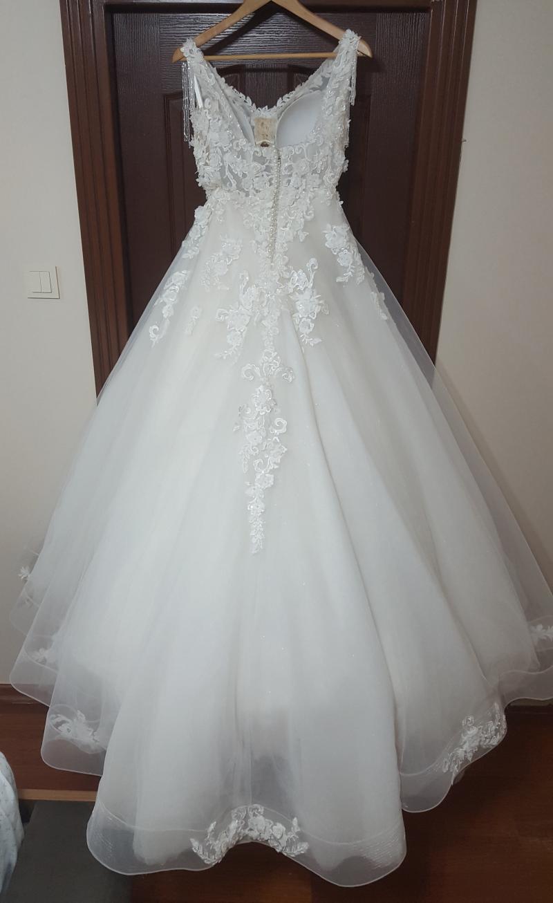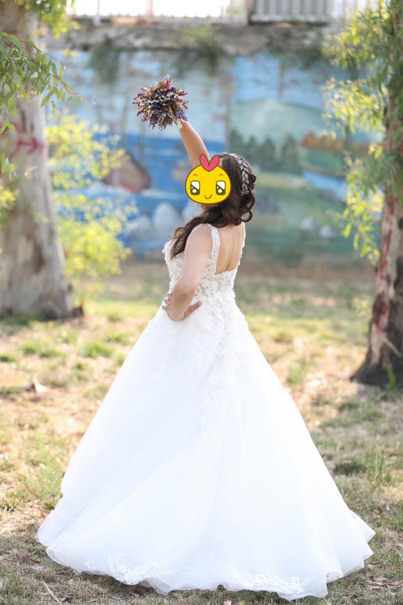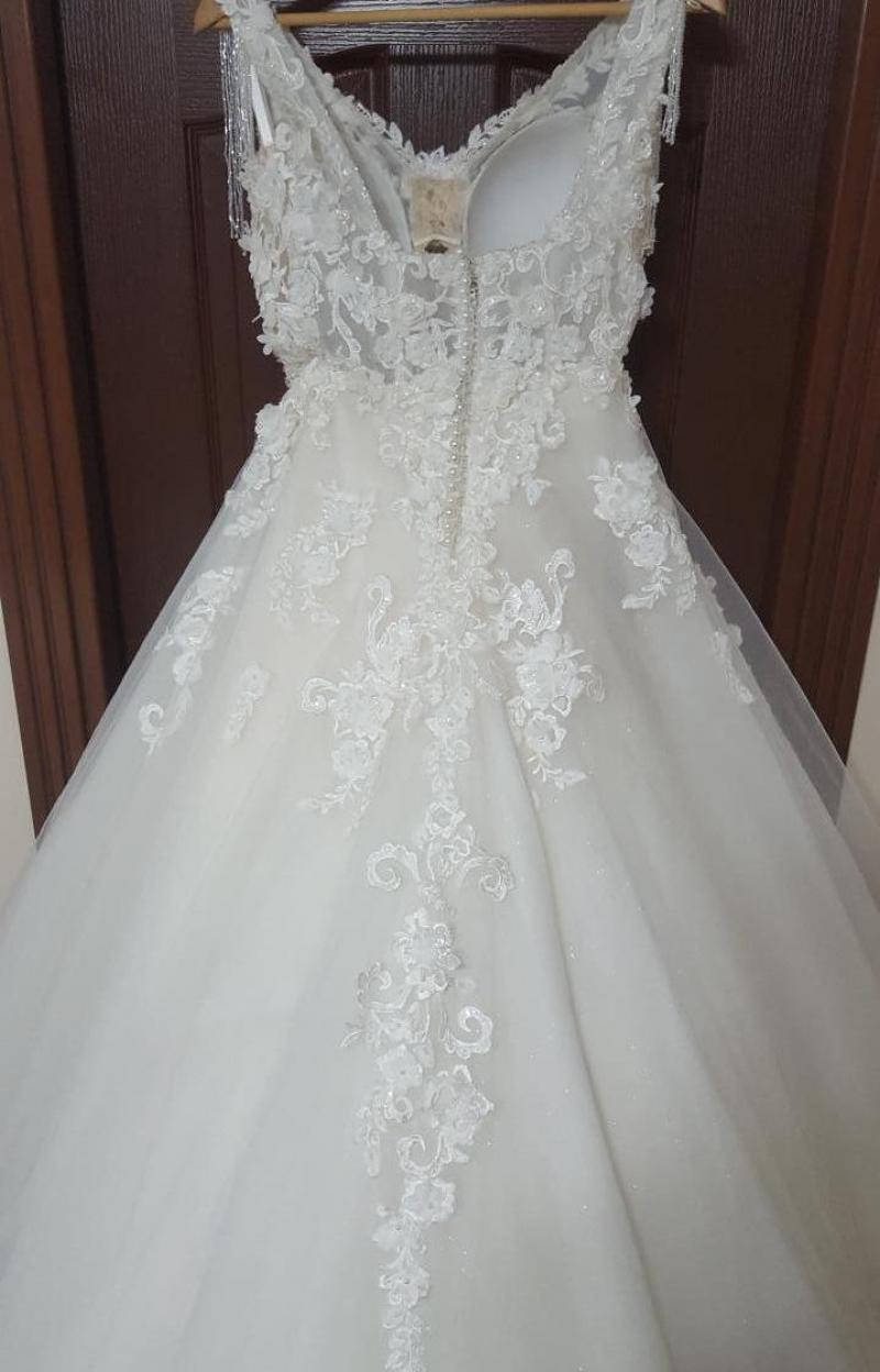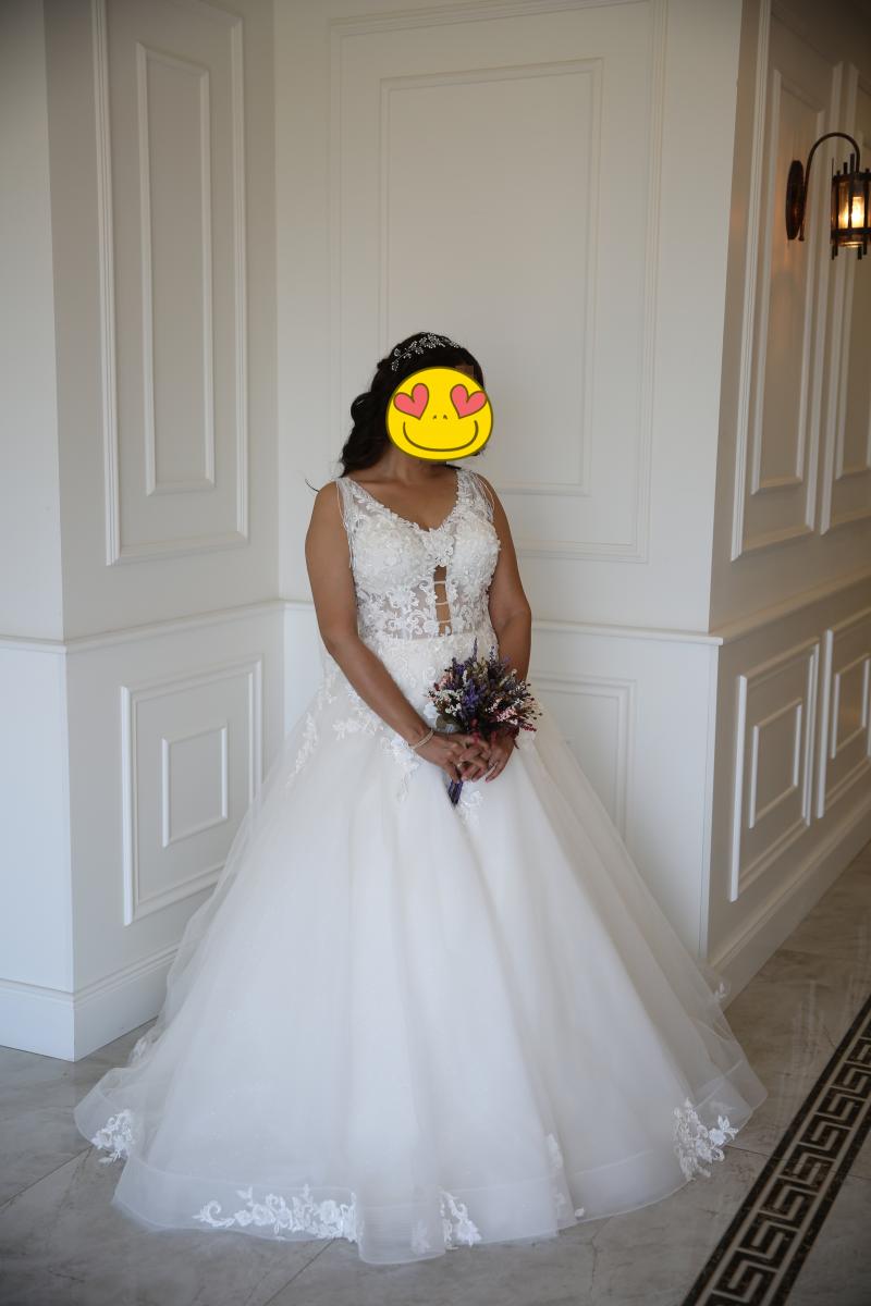 Gelinlik sıfır alınmış olup koltuk altı dekoltesi ve ön kısma dantel işlemesi ile küçük kapatmalar yapılmıştır. İnternet satış fiyatı 3800 TL olup +200 TL duvak ve +200 TL dantel işleme, tadilat 4200 TL ye mal olmuştur. Kuru temizlemeye ihtiyaç vardır.
