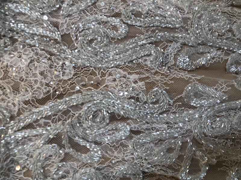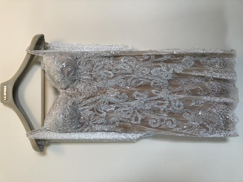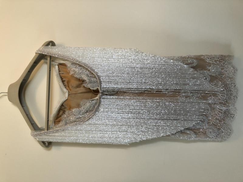 Raşid Bağzıbağlı (Rashid) tarafından özel olarak dikilmiş, nude astar üzerine beyaz işlemelerle dolu ve sırtından payetten oluşan parçalar sarkan bu harika gelinlik yalnızca 3 saat giyildi. Sahibinin Boy: 165 Kg: 47