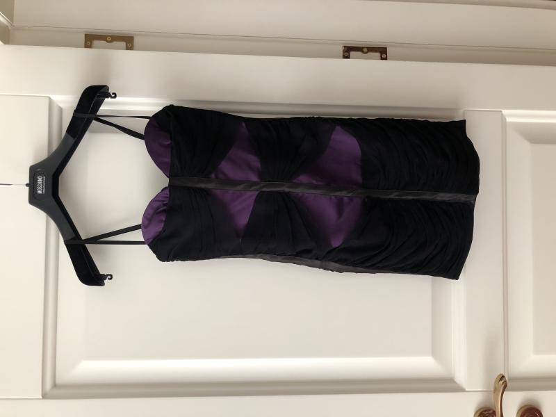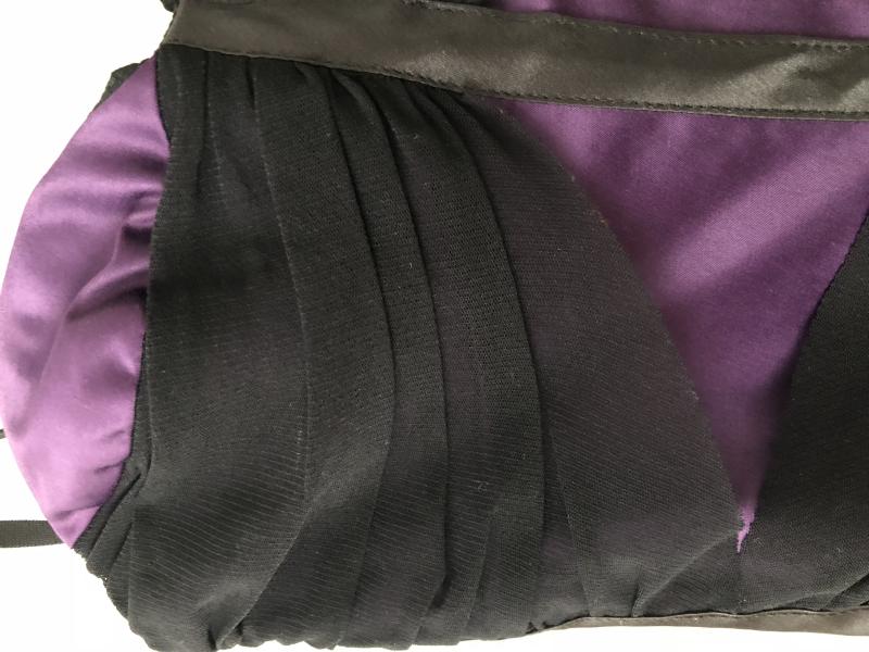 Mor üzerine siyah tül parçalar. İnce askılı, vücuda oturur. Arkası komple fermuar.